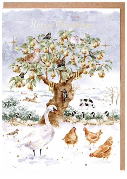 - Deze prachtige set kerstkaarten toont dieren die de twaalf dagen van Kerstmis uitbeelden. De set bevat acht kaarten en acht kraft enveloppen, geleverd in een geïllustreerde presentatiedoos, perfect om warme wensen te versturen tijdens de feestdagen. De kaarten zijn gedrukt op duurzaam geproduceerd structuurkarton. Aan de binnenkant van elke kaart staat: 'With best wishes for Christmas and the New Year.'