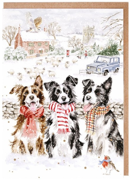- Deze prachtige set kerstkaarten toont drie bordercollies in de sneeuw. De set bevat acht kaarten en acht kraft enveloppen, geleverd in een geïllustreerde presentatiedoos, perfect om warme wensen te versturen tijdens de feestdagen. De kaarten zijn gedrukt op duurzaam geproduceerd structuurkarton. Aan de binnenkant van elke kaart staat: 'With best wishes for Christmas and the New Year.'