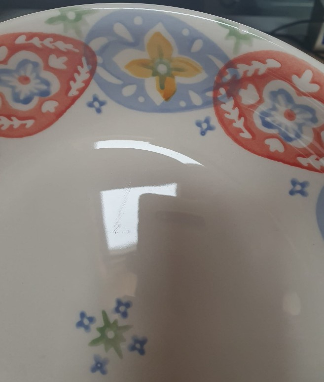 Let op: deze schaal is een b-keuze wegens krassen, oneffenheid in glazuur en chip van de onderrand, zie foto 4 t/m 7.