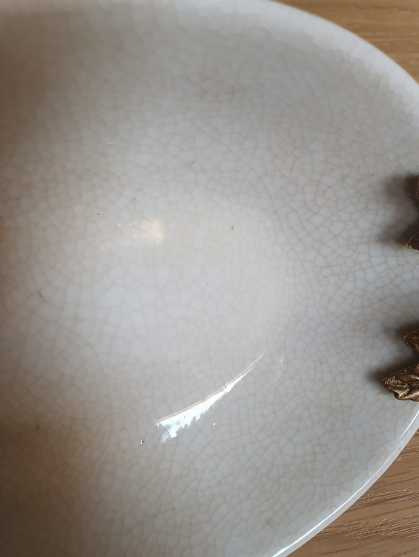 Klein craquelé aardewerk schaaltje afgewerkt met bronzen eekhoorntjes