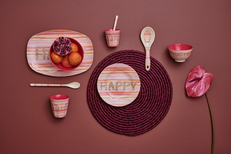 - Our well known salad spoon in melamine with handpainted stripes and beautiful flowers that write 'HAPPY' - we call this print the 'HAPPY-pink print'. The size of the spoon makes it practical and easy to use when the salad is served - and furthermore beautiful to look at.... Mix and match with our other melamine products in the same funky prints - or mix with another RICE print or color. We add everyday magic to the small details!