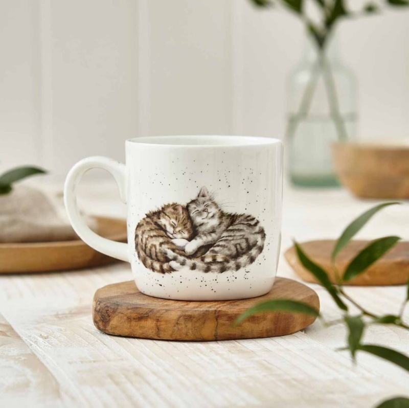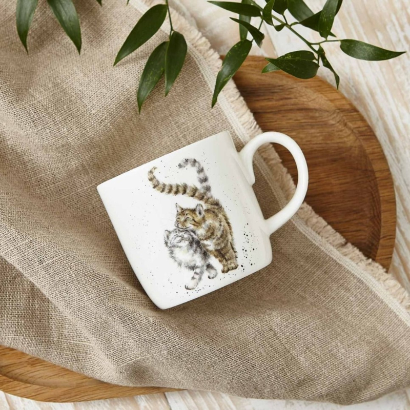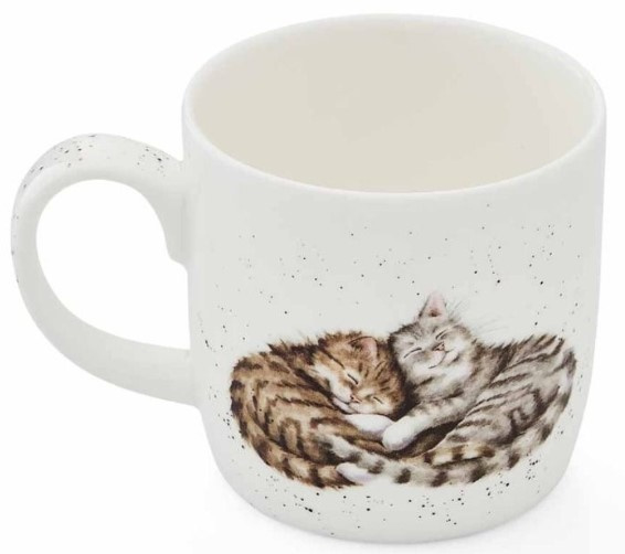 - Put a smile on your friend's face every day with this fine bone china mug from Wrendale Designs. This beautifully illustrated 'Feline Good’ mug made from fine bone china produced by Royal Worcester would make a lovely gift or perfect addition to your kitchen. This mug has a different image on the front and back and a third image on the inner rim.