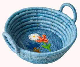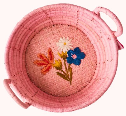 - Handgemaakt rond mini mandje met een mooi borduursel in het midden - het mandje is roze of blauw met bloemen in het midden. Het mandje heeft twee praktische handvaten. Het kleine mandje ziet er zo leuk uit dat het elke kamer zal sieren. Gebruik het voor sieraden, suikerklontjes, kleine spulletjes of om een kaarsenhouder in te zetten.