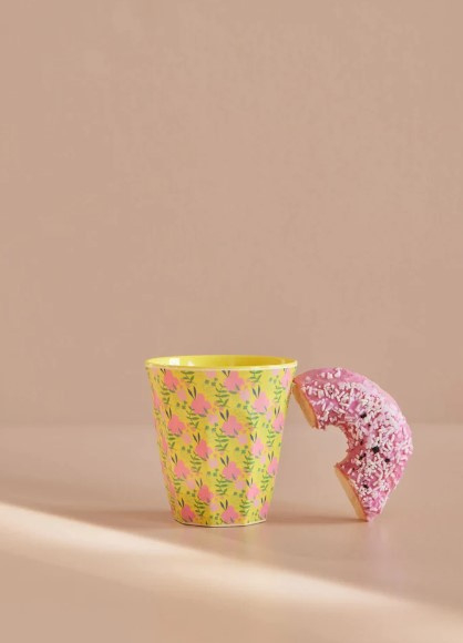 - De populaire melamine beker met leuke roze bloemen op een gele achtergrond. We noemen de print "Sunny Days" (Zomerdagen) print. De beker is super praktisch voor zowel kinderen als volwassenen. Hij kan overal voor gebruikt worden - om te drinken, voor potloden of voor een picknick. Alleen jouw fantasie bepaalt de grenzen. Houd er rekening mee dat melamine producten niet geschikt zijn voor de magnetron.