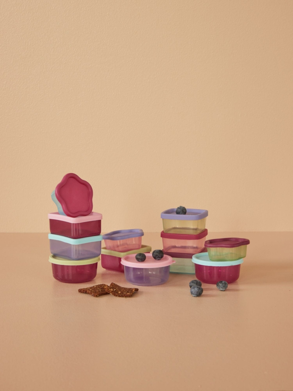 - Super handige opbergbakjes voor noten, olijven, dressing, een kleine snack ... of waarvoor je het ook maar voor nodig hebt. Ze worden verkocht in een netje met 12 leuke bakjes in verschillende kleuren en vormen. Praktisch voor de lunch van jou en je kinderen en ze passen perfect bij al onze andere opbergproducten.