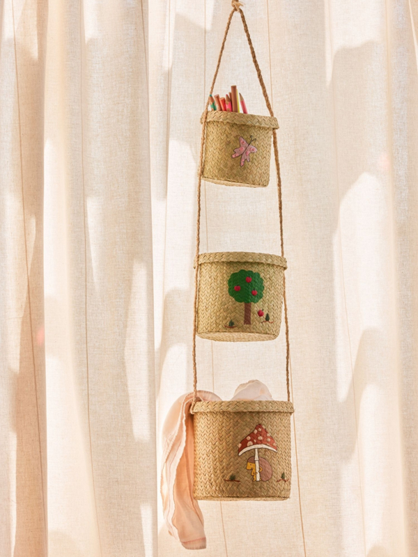 Ready to have some forest fun with the cutest hedgehog and his favorite mushroom. These hanging 3-tier raffia baskets with Happy Forest theme are the perfect playful storage for toys, small books, Mr. teddy, and all the other things that are making a mess in the kid’s room.