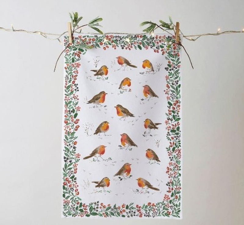 - De roodborstjes op deze traditionele theedoek illustreren de ware essentie van Kerstmis. Omlijst door prachtige winterhulst en bessen, is deze theedoek van Ulster Weavers het perfecte cadeau voor vrienden en familie tijdens de feestdagen.
